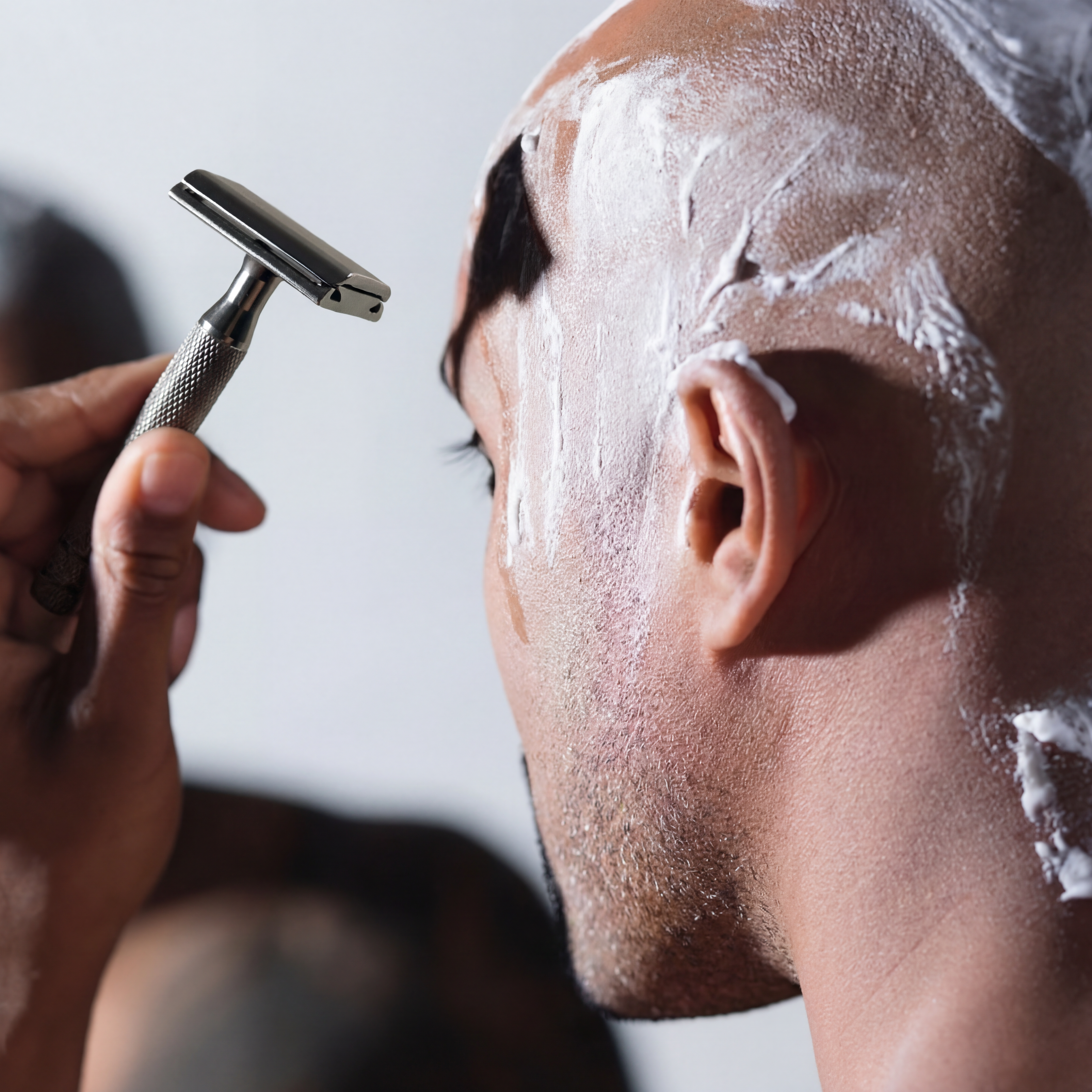 Commencez par humidifier votre peau avec de l’eau chaude afin de ramollir le poil et d’ouvrir les pores. Appliquez ensuite une mousse à raser ou une huile de rasage pour assurer une meilleure glisse. Tenez le rasoir avec un angle d’environ 30° et laissez-le simplement glisser sans exercer de pression : son poids fait naturellement le travail. Rasez-vous par petits mouvements, en rinçant régulièrement la tête pour éviter que les poils ne s’accumulent. Une fois le rasage terminé, rincez votre visage à l’eau froide pour resserrer les pores, puis appliquez une crème apaisante pour calmer la peau